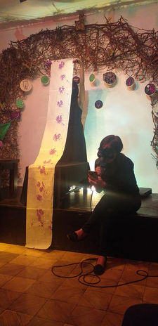 En este performance, realizo una imagen gráfica al imprimir la parte más íntima de mi cuerpo, pintada por sangre menstrual y acrílico color lila sobre un papel arroz delicado y delgado mientras Xochiquetzal Salazar, Alma Karla Sandoval y Denisse Buendía leen sus poemas selectos.